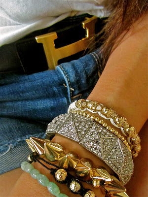 | Tank: Wildfox // Sandals: Christian Louboutin Nuria // Jeans: Zara // Sunglasses: Tiffany & Co. Wrap Bracelet: Balenciaga Arena Giant Rose Gold // Spike Bracelet: Asos Clover Bracelet: Purchased at Dash NYC // Earrings: Anthropologie // Nails: Comme Des Garcons inspired |